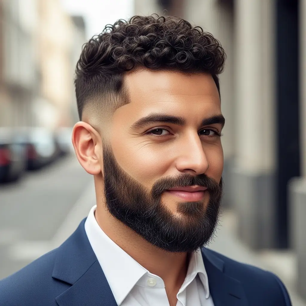 A curly buzzcut and shaped beard combination celebrates natural texture while keeping everything under control. The tight curls add character, while the well-defined beard frames the face beautifully. This pairing suits men who want to embrace their natural hair while maintaining a sharp, professional finish.