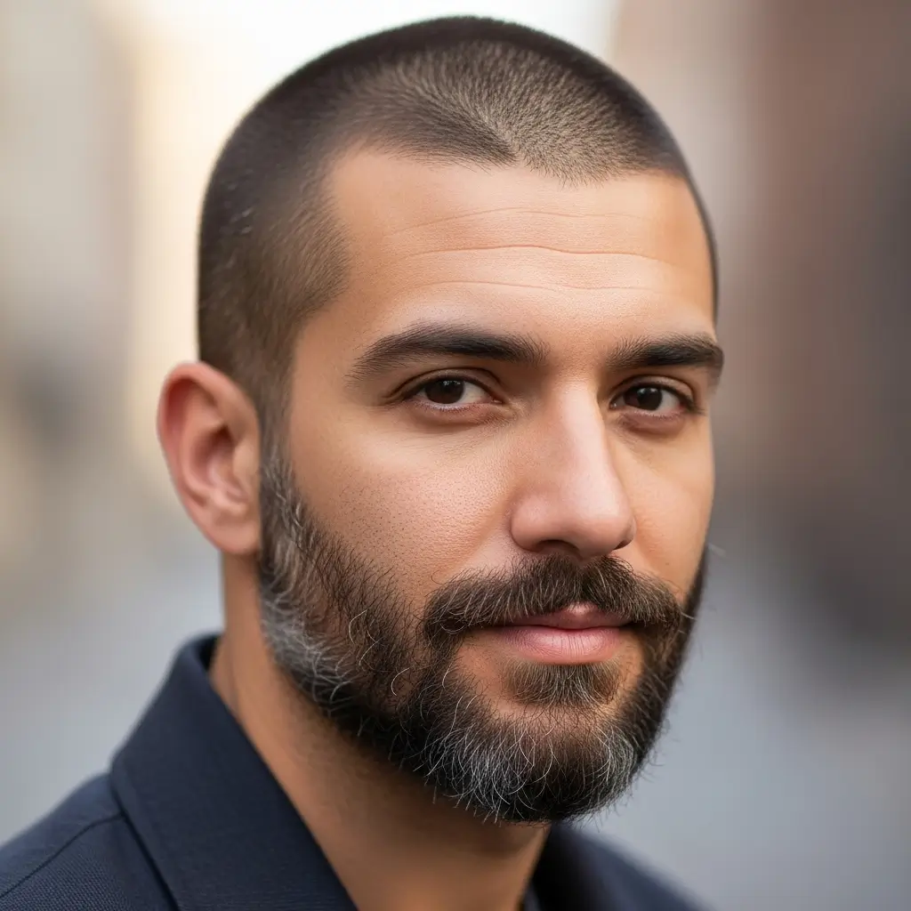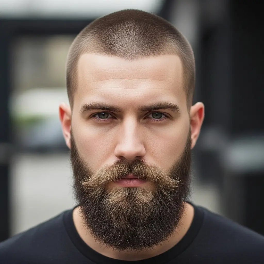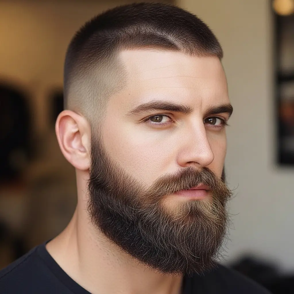 The classic buzzcut and full beard pairing is timeless and masculine. The clean, uniform cut highlights facial features while the full beard adds depth and rugged charm. This look works great for men who want a low-maintenance yet powerful style that suits any occasion, from casual days to professional settings.