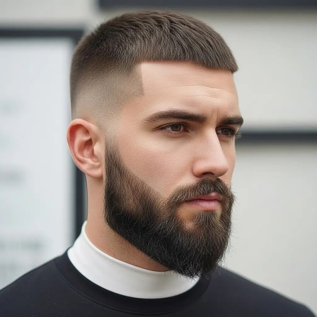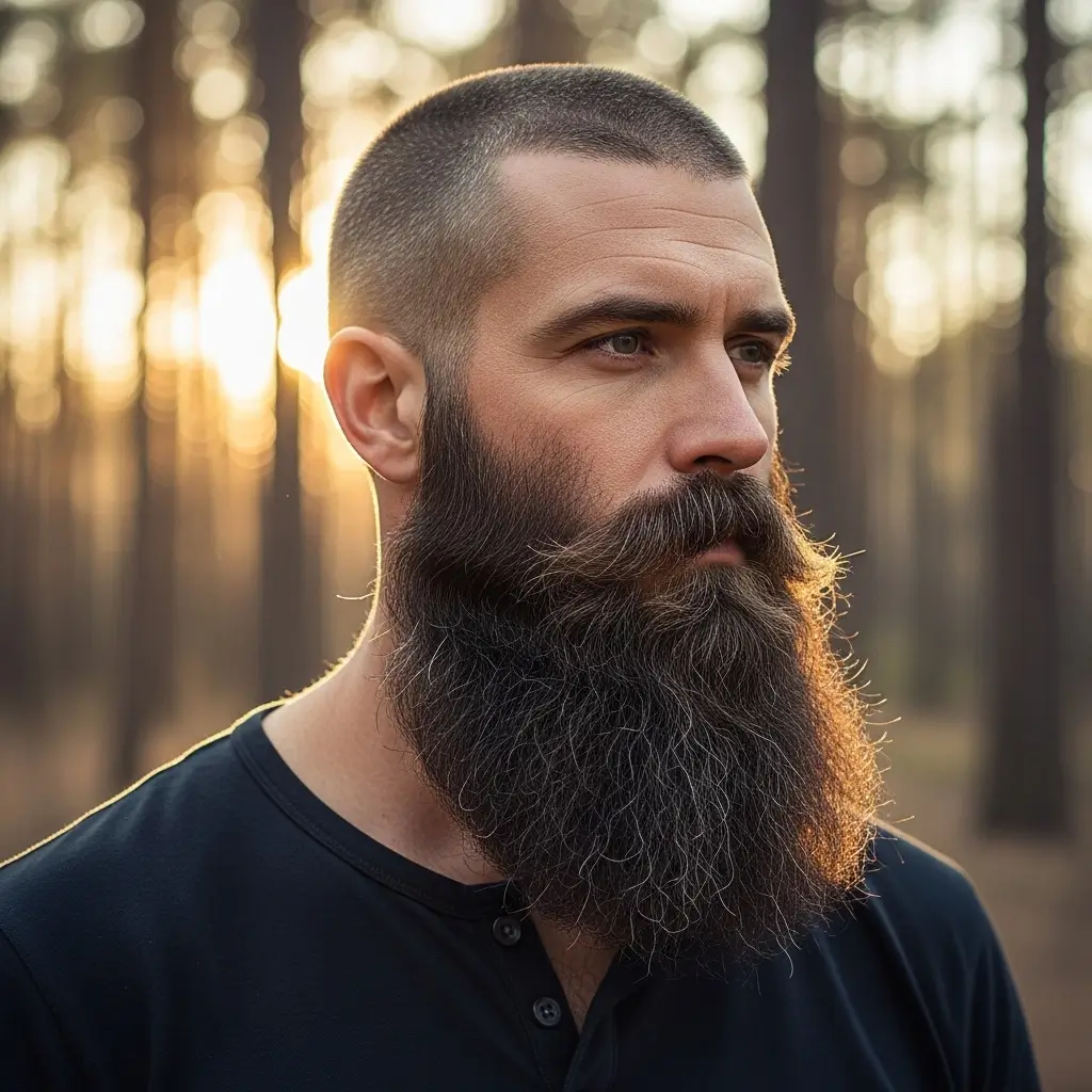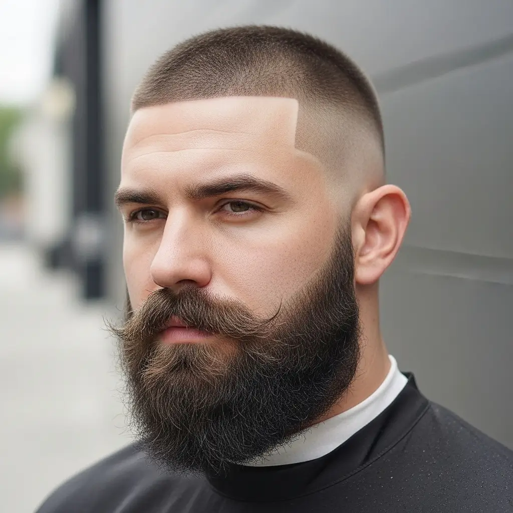 The classic buzzcut and full beard pairing is timeless and masculine. The clean, uniform cut highlights facial features while the full beard adds depth and rugged charm. This look works great for men who want a low-maintenance yet powerful style that suits any occasion, from casual days to professional settings.
