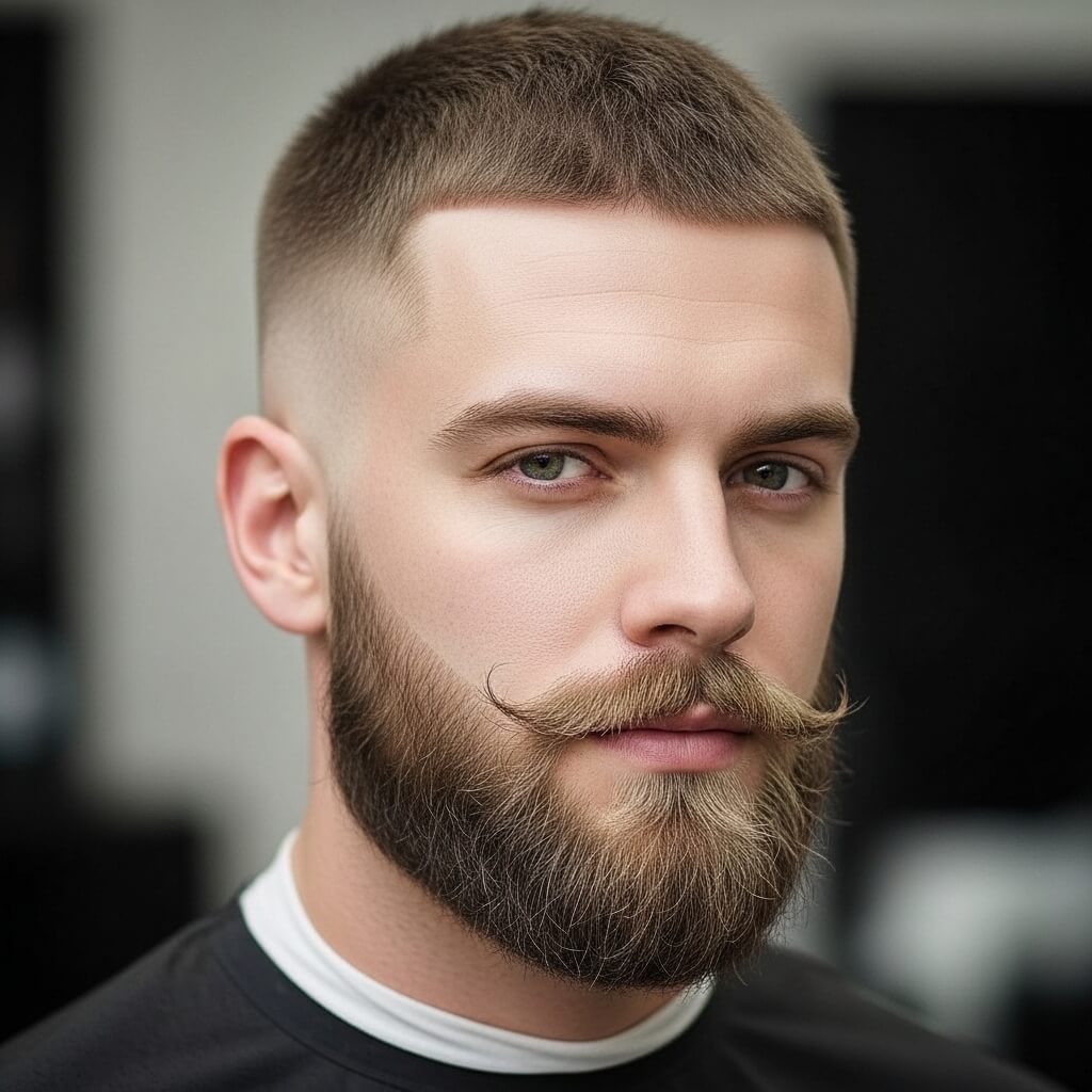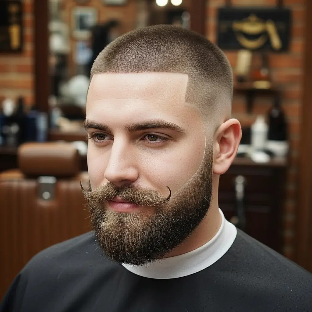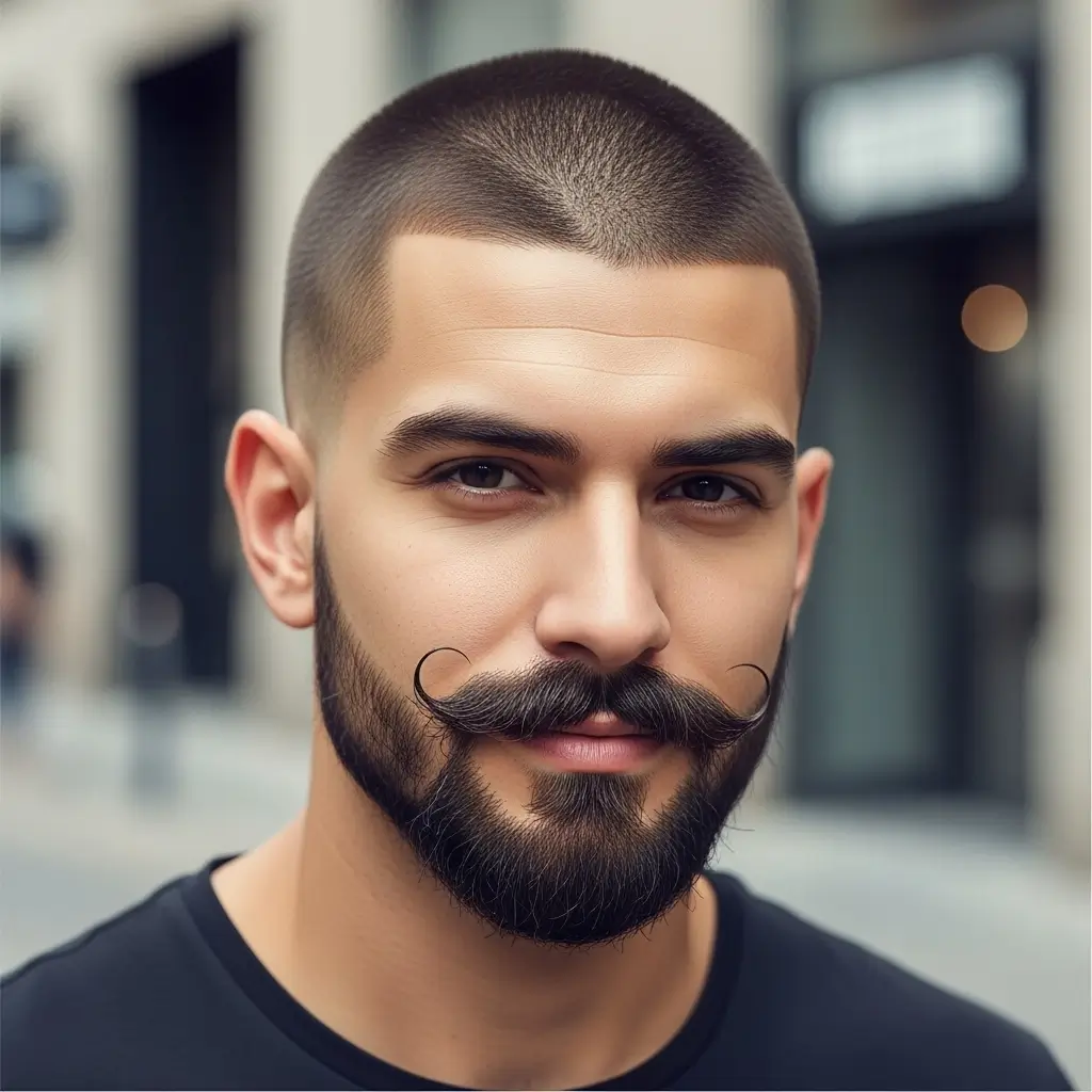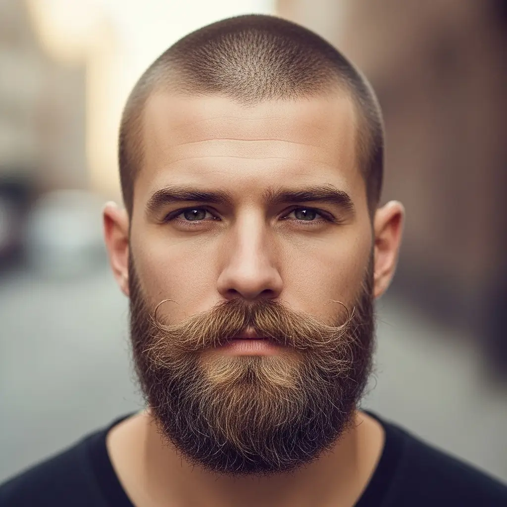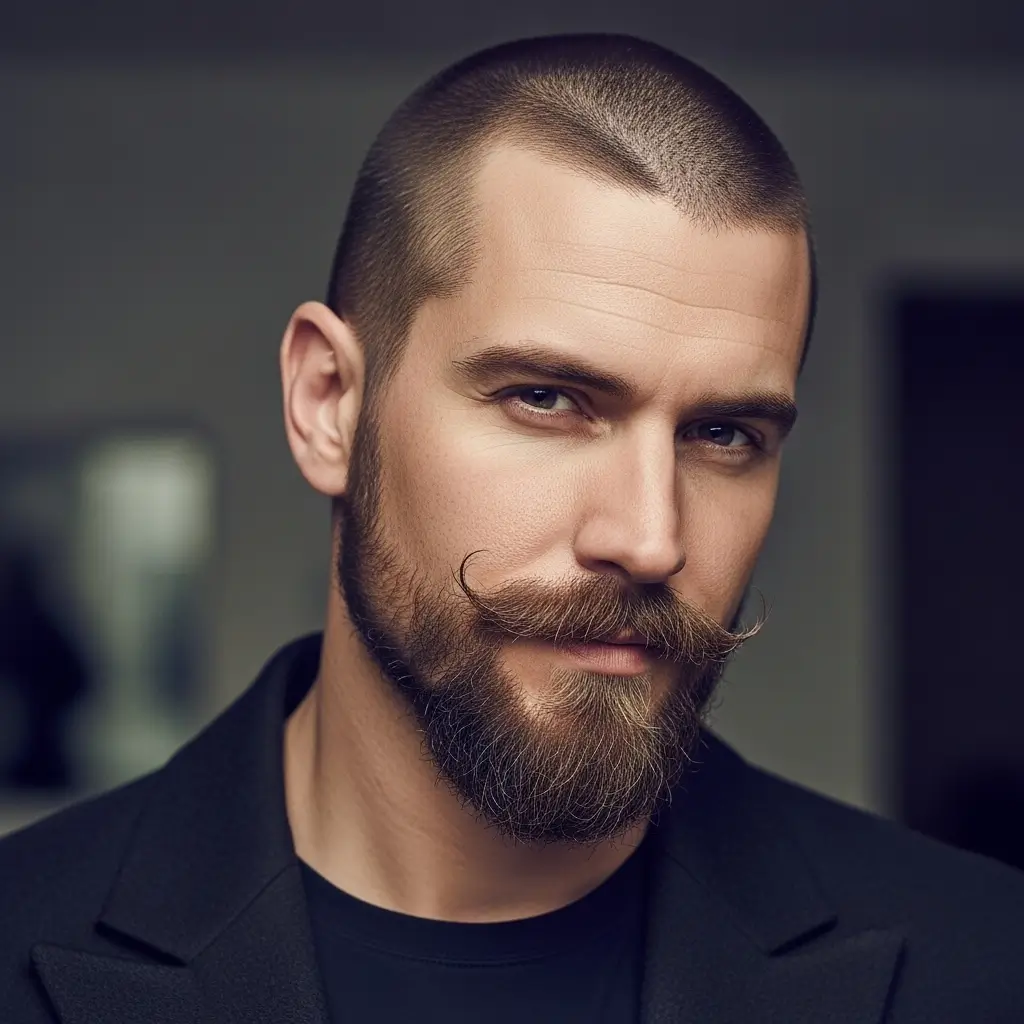 Pairing a buzzcut with a thick mustache and beard delivers vintage masculinity with modern flair. The mustache adds personality, while the beard provides volume and balance. Combined with a neat buzzcut, this look feels powerful, charming, and versatile enough for any style preference or face shape.