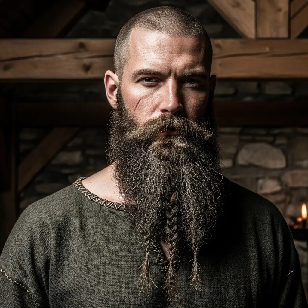 Go bold with a buzzcut and Viking beard combination. This pairing radiates strength and confidence, blending ancient warrior energy with modern minimalism. The thick, long beard contrasts perfectly with the short buzzcut, creating an unforgettable look that’s rugged, commanding, and full of character.