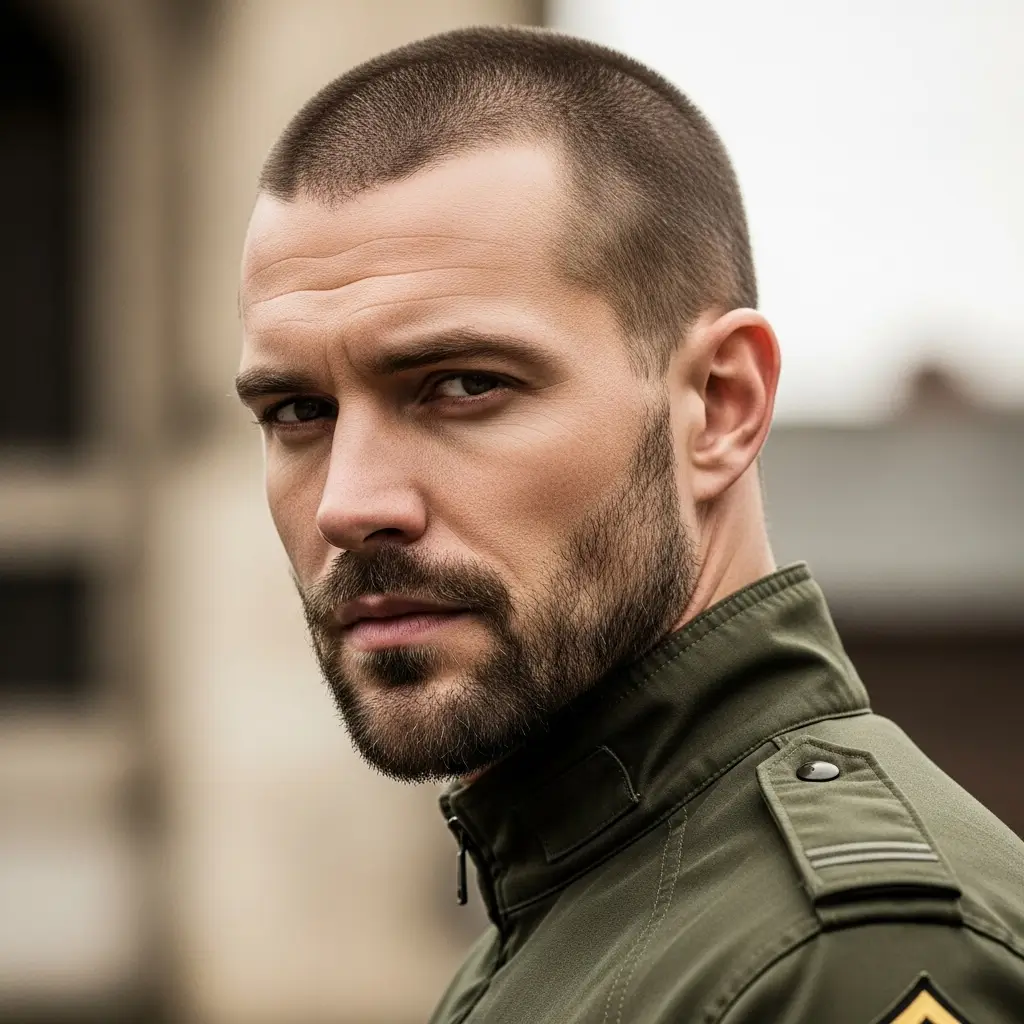The military buzzcut and short beard combination screams confidence and discipline. It’s neat, structured, and gives off a no-nonsense attitude. The short beard softens the sharpness of the buzzcut, offering a balanced look that’s both commanding and stylish  ideal for men who prefer a tough yet refined image.