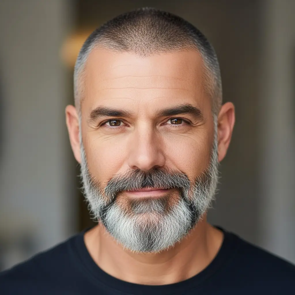 The buzzcut with salt and pepper beard exudes mature confidence. The short cut draws attention to the textured, naturally graying beard, highlighting wisdom and experience. This pairing proves that age can enhance style, creating a dignified yet effortlessly modern look that’s both attractive and commanding.