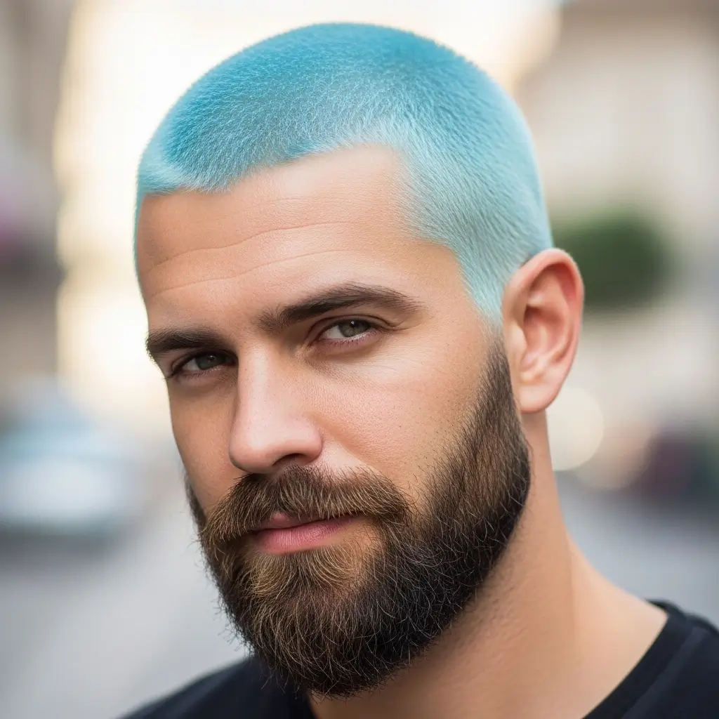 Make a statement with a dyed buzzcut and contrasting beard. Whether you go platinum blonde, icy silver, or pastel tones, pairing it with your natural beard color creates a bold, trendy contrast. This look is ideal for risk-takers who love experimenting with color while maintaining that masculine edge.