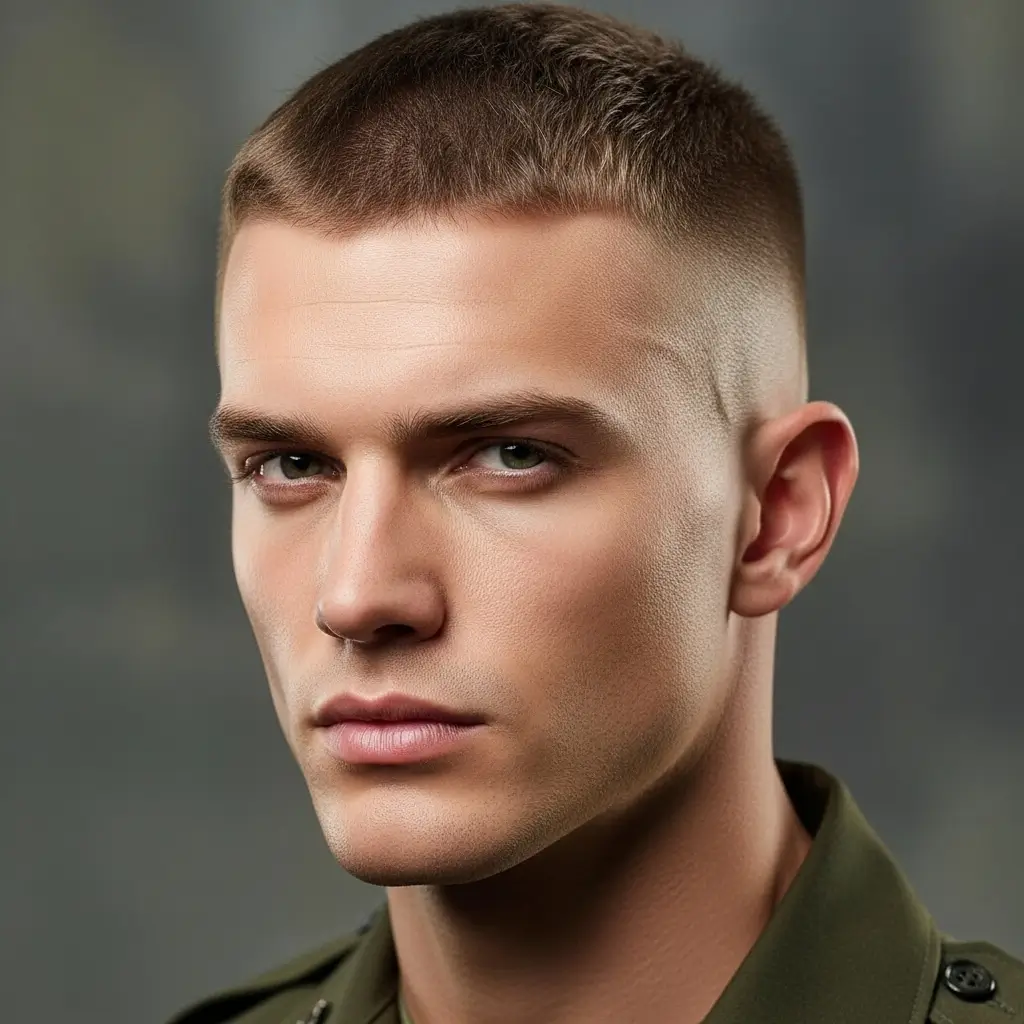 The military crew cut is defined by its extremely short, uniform length, offering a disciplined and rugged appearance. This haircut is perfect for men who value practicality, low maintenance, and a clean finish. Its sharp simplicity highlights facial features and delivers a strong, confident look suitable for any man.