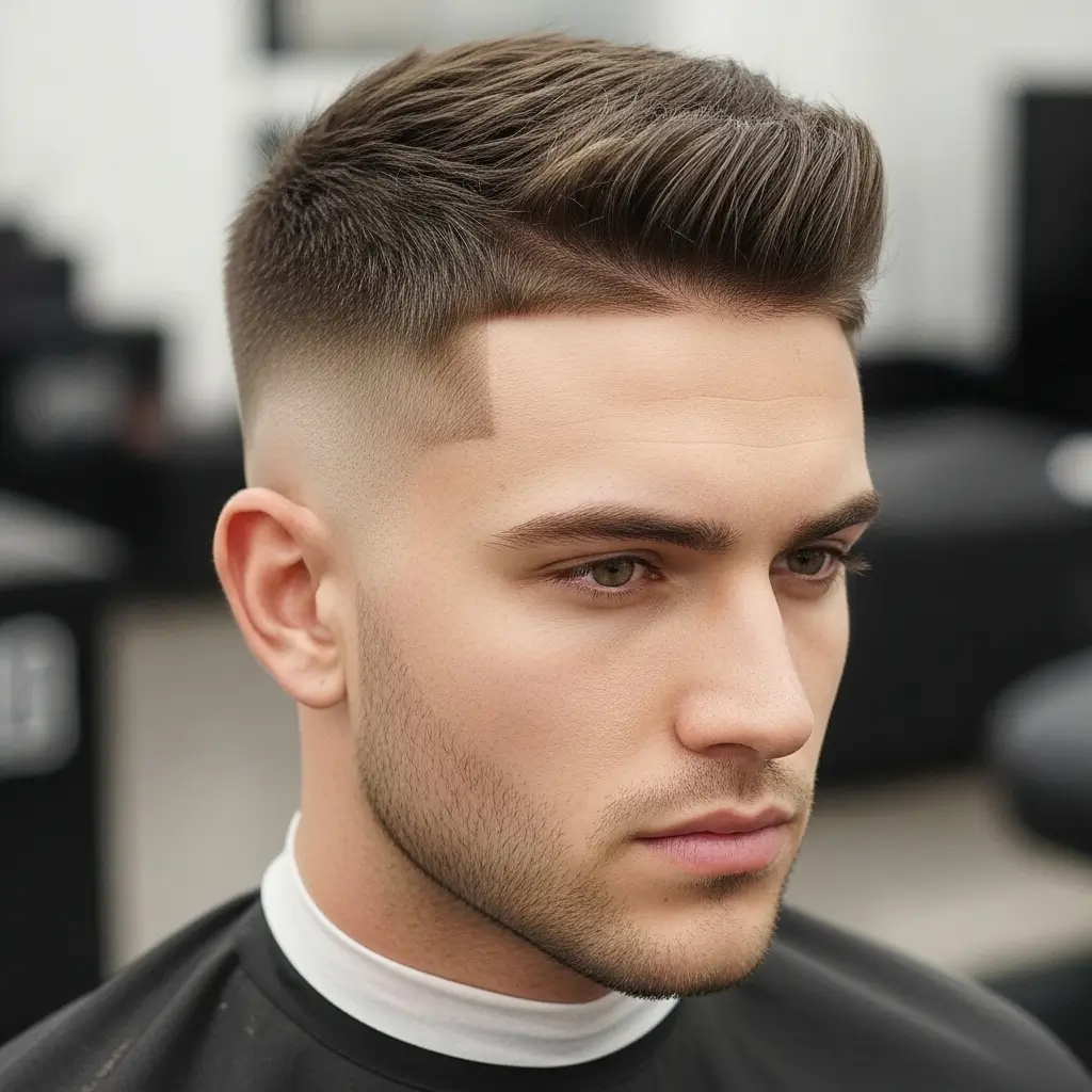A high fade crew cut delivers maximum sharpness with its bold, clean sides. The high fade creates a striking contrast between the top and the sides, making the haircut visually strong. It’s perfect for men who enjoy modern, edgy styles that define the face and make the top hair stand out.