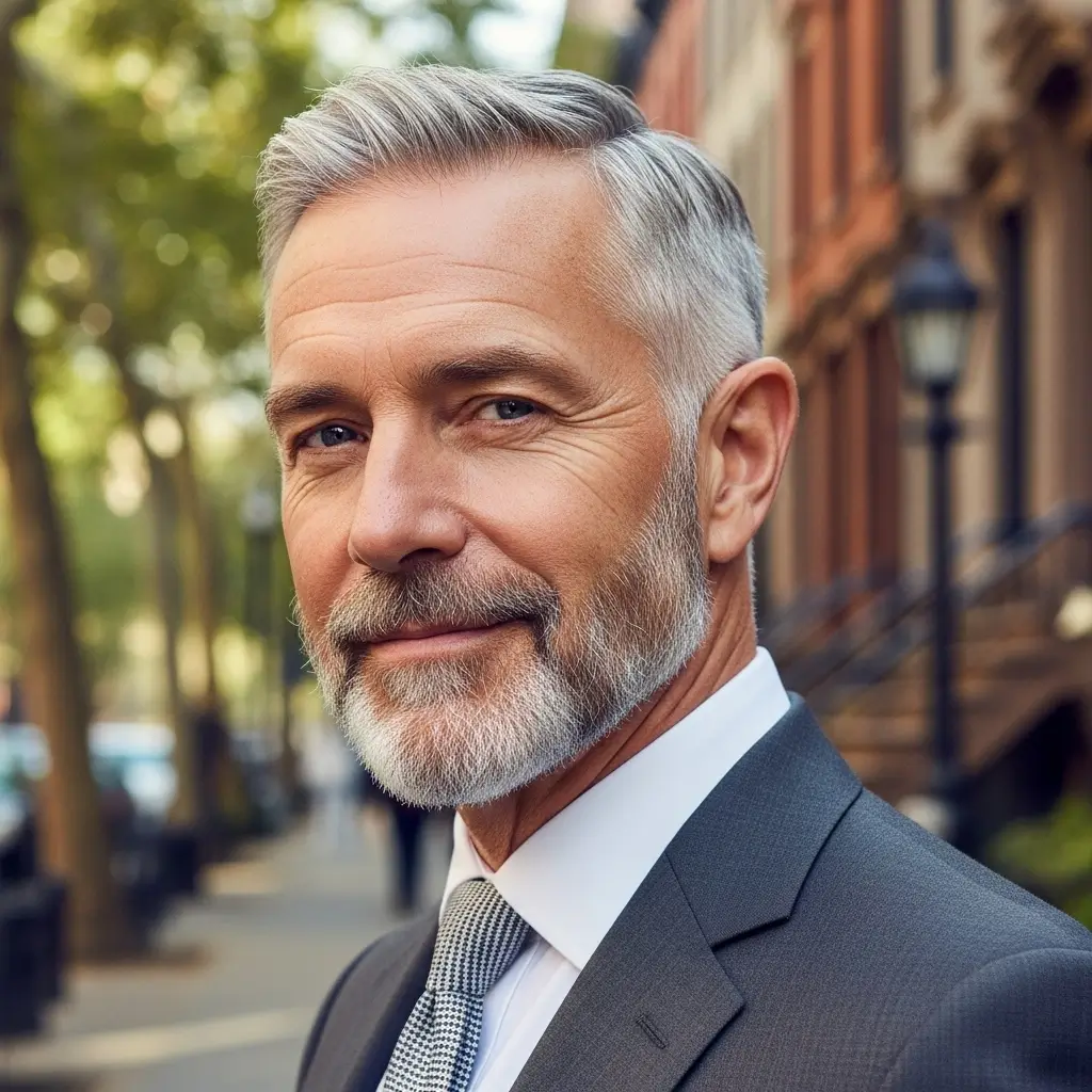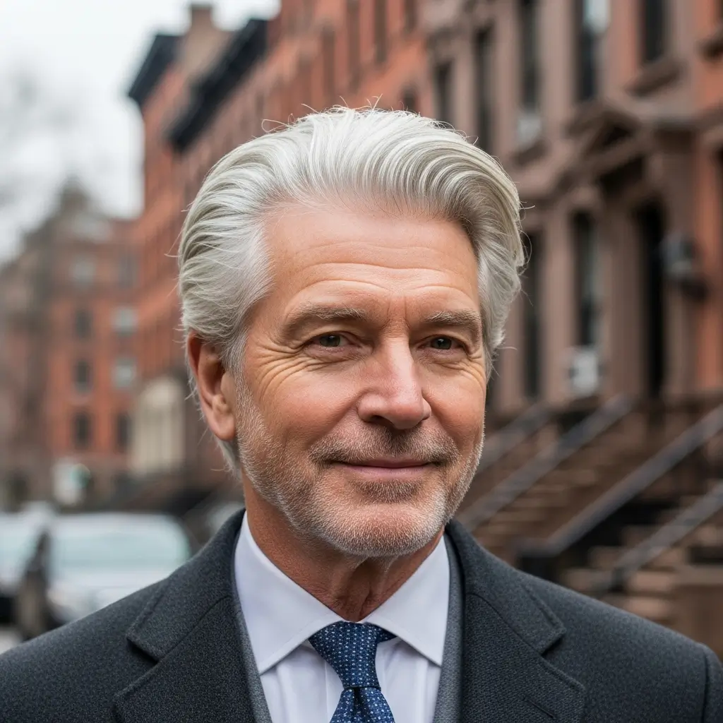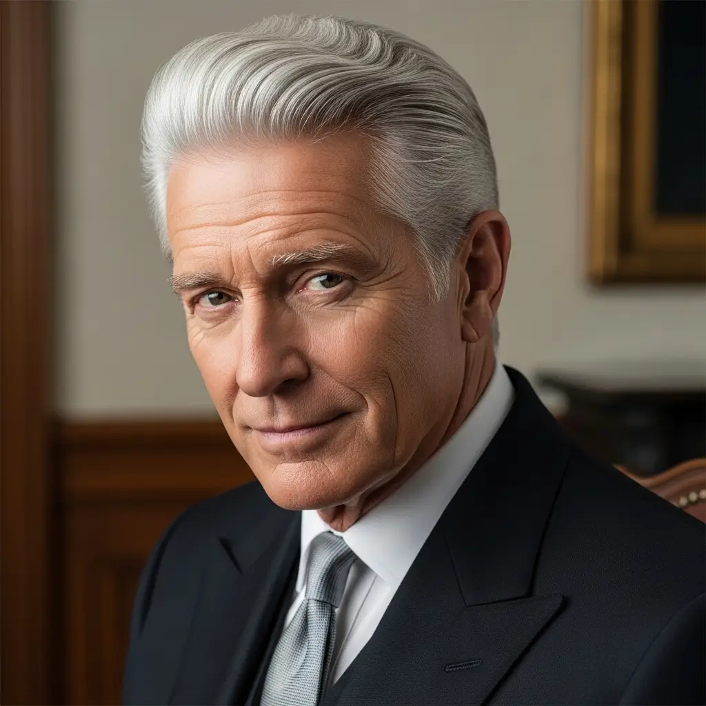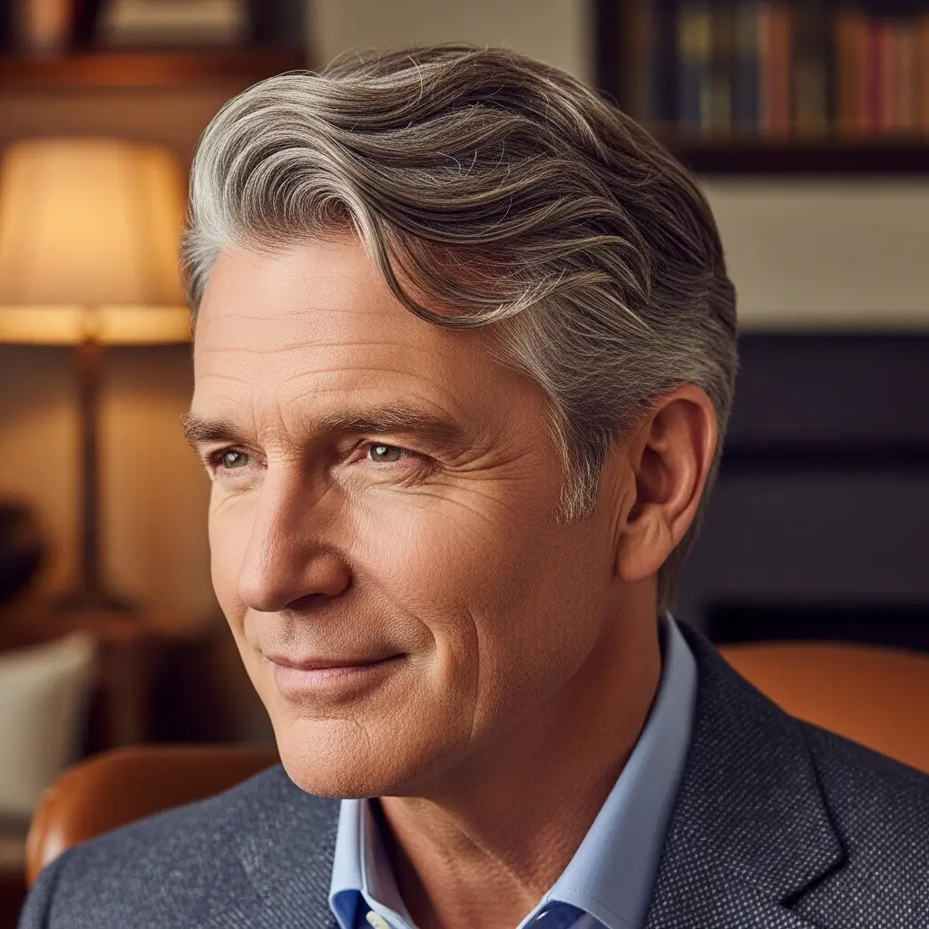 Celebrate your natural gray with the iconic silver fox look. Instead of hiding your age, this style embraces it with pride and style. Neatly trimmed and well-groomed hair enhances your sophistication, making this one of the most empowering hairstyles for men over 60 that radiate maturity and charm.