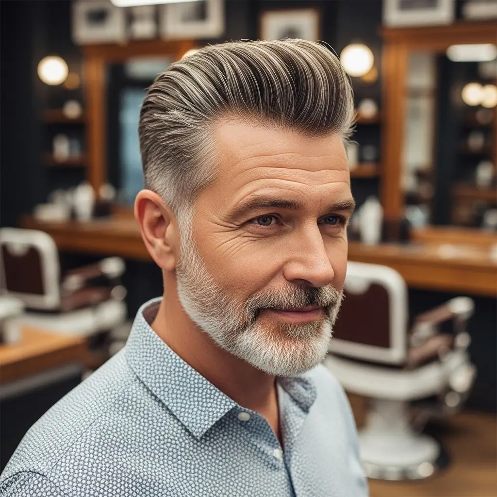 This hairstyle adds volume at the top with a neatly defined side part. It’s an excellent choice for men with thinning hair who still want a fuller look. Polished and confident, it stands among the most flattering hairstyles for men over 60, combining tradition with a subtle modern twist.