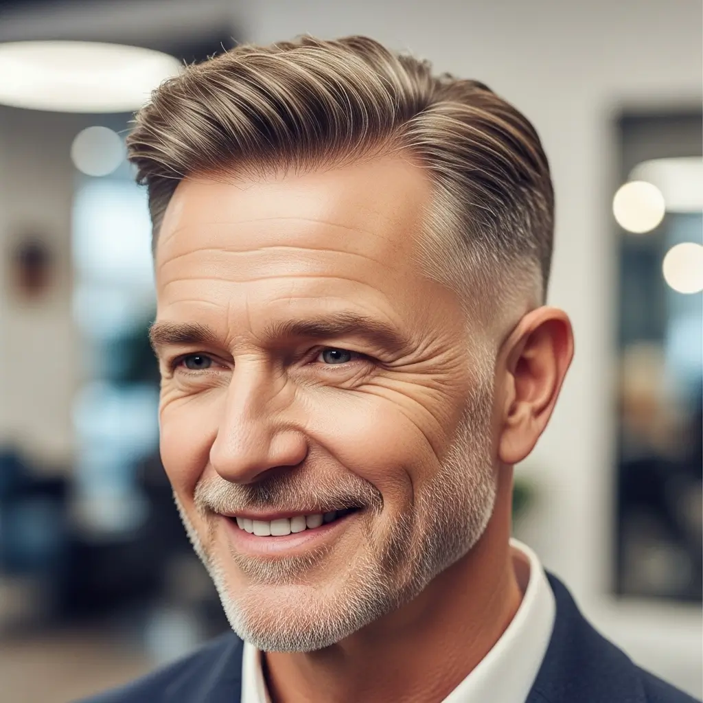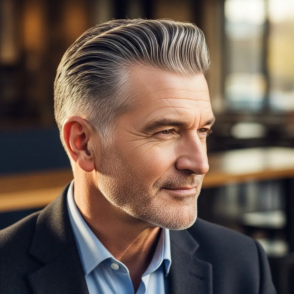 The slick side fade offers a clean, precise look that modernizes traditional cuts. With sharp lines and sleek texture, it exudes confidence and polish. This hairstyle works well for both casual and formal events, ranking among the sharpest hairstyles for men over 60 who appreciate sophistication with style.