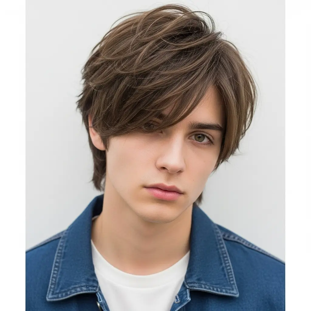 Medium-length hair with a messy fringe creates texture and a youthful vibe. The fringe adds personality while the layers ensure volume. It’s perfect for men looking for a low-maintenance, stylish look. Use light styling products to maintain a carefree, textured feel throughout the day.