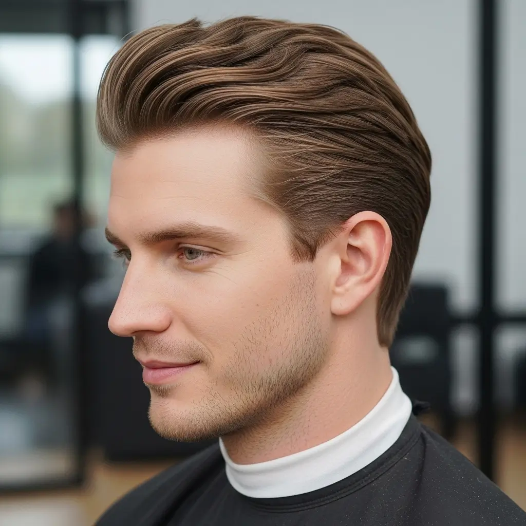 This medium-length haircut features a lifted top with volume and smooth sides. The pompadour adds elegance and sophistication, perfect for men seeking a statement hairstyle. Styling requires a blow dryer and a high-hold product to maintain the height and structure throughout the day.