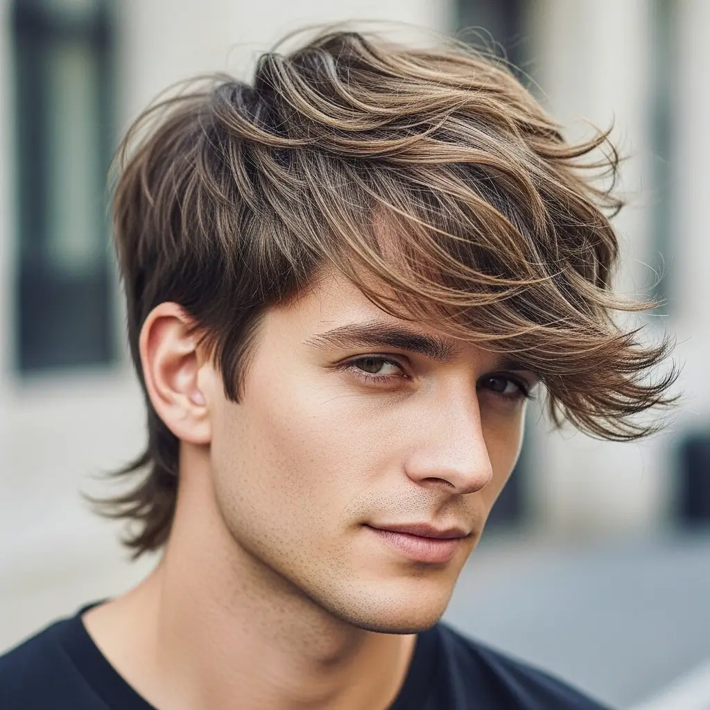 This medium-length shag haircut with a side part adds movement, volume, and effortless style. Layers at different lengths create texture and dimension, making it suitable for men who want a modern, edgy look without spending too much time styling.