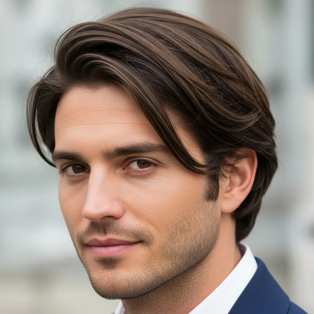This classic medium-length haircut features a deep side part that enhances volume and shape. It works well with straight, wavy, or thick hair. Styling is effortless with a comb and styling cream to keep hair in place. Ideal for formal occasions or casual events alike.