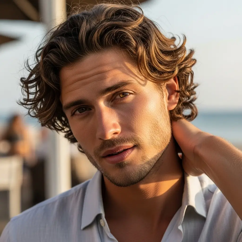 Medium-length tousled waves offer a carefree, textured look that feels natural and voluminous. Layers throughout add movement, making it easy to style. Perfect for men with naturally wavy or curly hair, this haircut gives a modern and effortlessly stylish appearance that requires minimal effort.