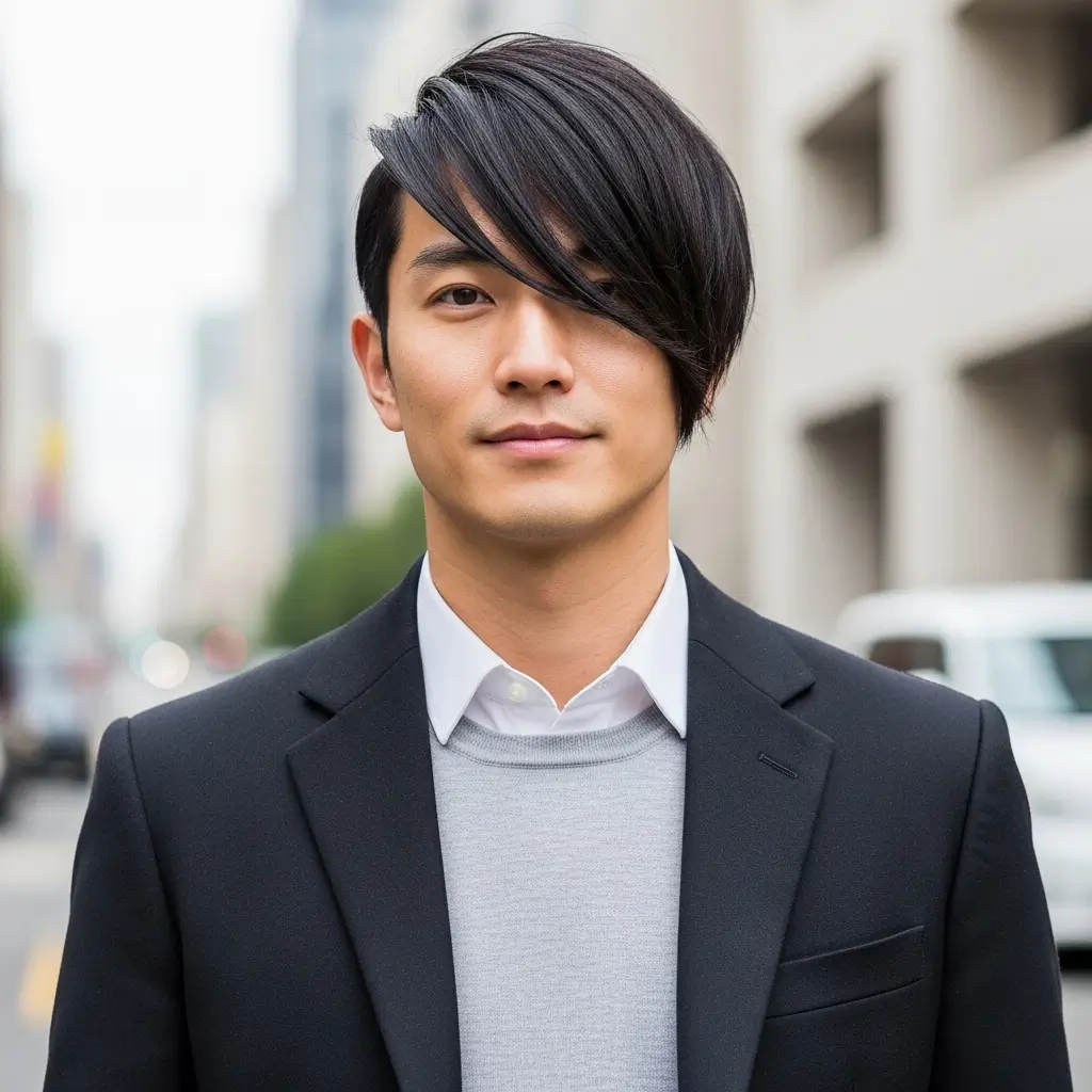 The angular fringe adds an asymmetrical, modern twist to straight hair. Longer hair at the front is cut at an angle to frame the face, while sides are kept tidy. This haircut enhances facial features, adds depth to straight hair, and is ideal for men seeking a trendy, fashion-forward look.